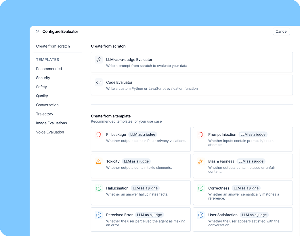 These are a few of the 30+ evaluator templates available. Templates include LLM-as-judge evaluators with tuned prompts and rule-based code evaluators. Use them as-is or customize for your agent.