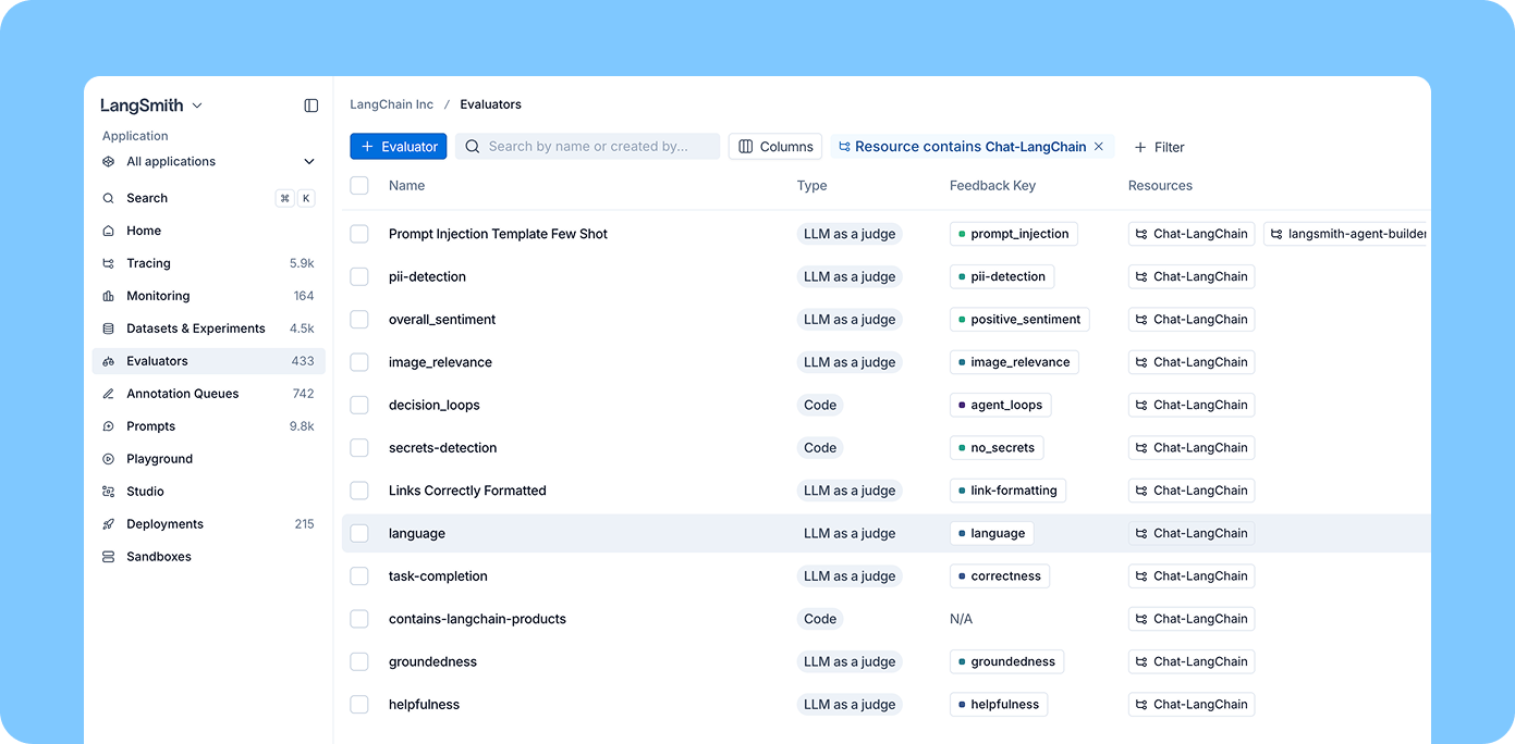 - Evaluator templates give you a running start. LangSmith now includes 30+ templates covering safety, response quality, trajectory, user behavior, and multimodal evaluation. Use them as-is or customize them — they work for both online monitoring and offline experiment runs.