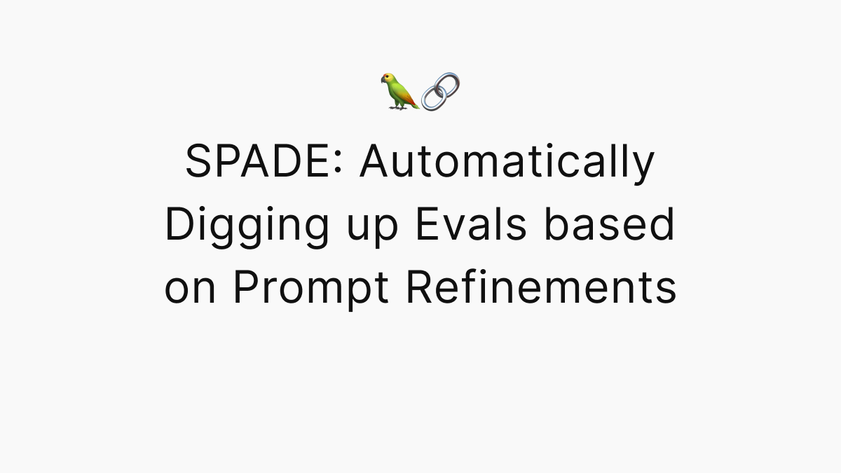 We’re building a tool to automatically recommend evals called SPADE ♠ ️, or System for Prompt Analysis and Delta-based Evaluation. We’re excited to be collaborating with LangChain on this project and releasing a prototype of SPADE. You can paste your prompt or link to your LangSmith prompt version history, and based on your prompt refinements, SPADE might suggest automatic evaluation functions in Python that you can run on all your chain input-output (i.e., prompt-response) pairs. Evaluation functions can range in complexity, from asserting that an LLM response follows a specific format (i.e., inclusion of certain keys in a JSON object or headers in a Markdown object) to verifying that an LLM response doesn’t hallucinate sources beyond what is provided in the prompt.