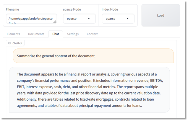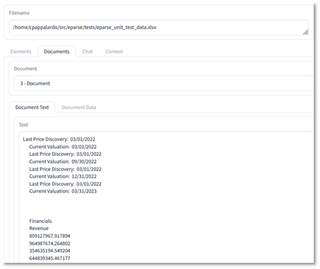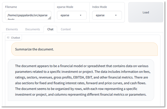 eparse does things a little differently. Instead of passing entire sheets to LangChain, eparse will find and pass sub-tables, which appears to produce better segmentation in LangChain. Using eparse, LangChain returns 9 document chunks, with the 2nd piece (“2 – Document”) containing the entire first sub-table. Asking the LLM to summarize the spreadsheet using these vectors produces a more comprehensive view of what is contained in the spreadsheet, including the nuances of the sub-tables, and without any erroneous data.