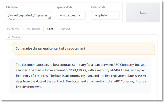 With default implementations, the LLM understood some aspects of the file but did not get a good general sense of the content. Also, the amounts are off, the loan amount appears to be 10x higher than the amount in the file, ignores the other loans, and the LLM is misunderstanding the unformatted Excel date value (a 44,621 day maturity would be 122+ years).