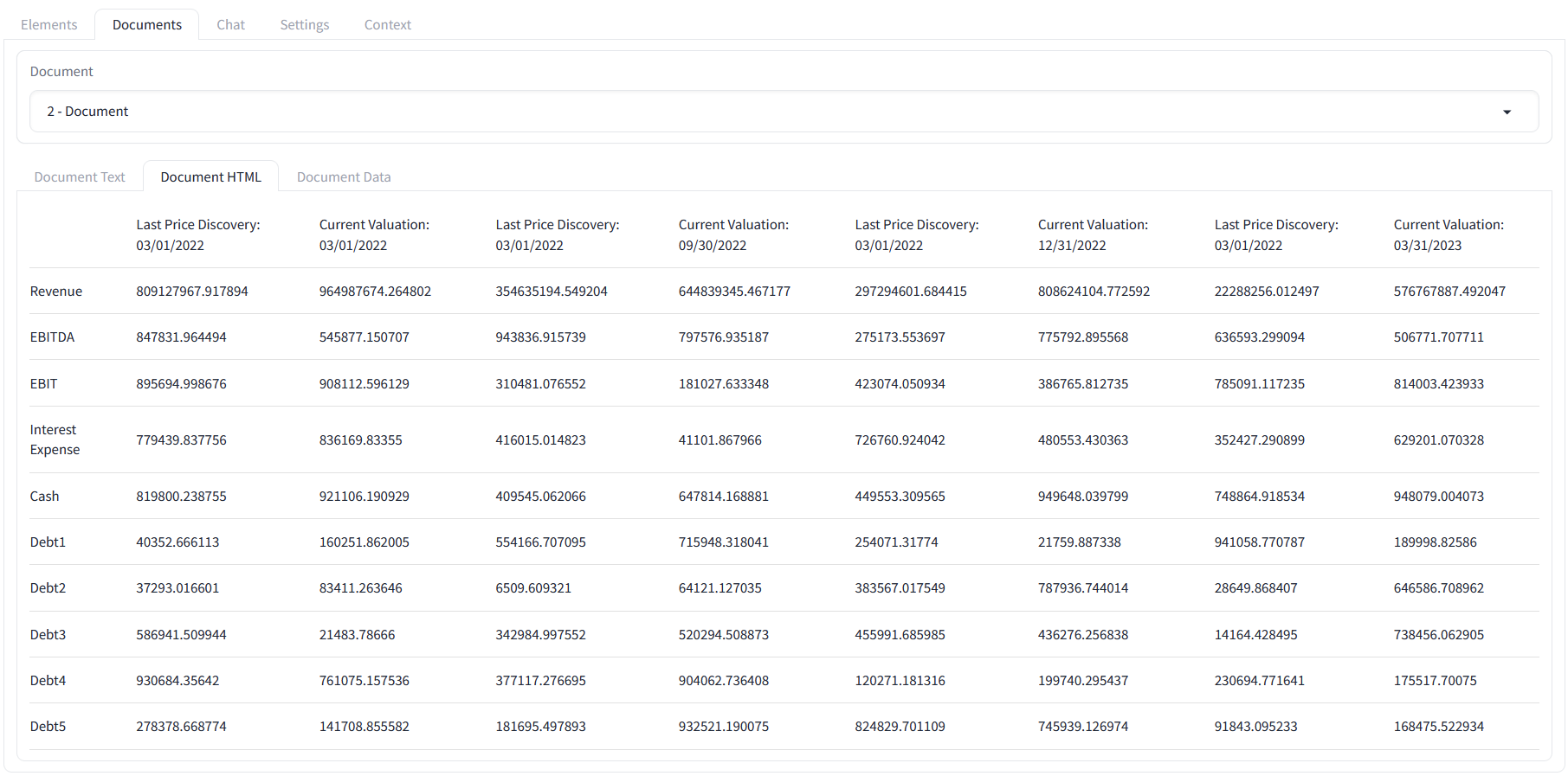 Unstructured produces a single text element which LangChain chunks up into 14 pieces, with the 3rd piece (“3 – Document”) containing the first sub-table I depicted above. Each cell in this table is a separate line, and the 3rd piece contains about 40 lines, which is not the entire table.