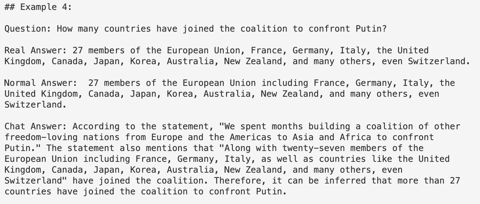 We can see in this example that the GPT3 is nearly exactly the same as the real answer. This is almost certainly due to the fact that we used GPT3 to generate the question/answer pairs. The ChatGPT answer is more verbose, and while not technically incorrectly it is not as specific and direct as the GPT3 answer. Again, this is likely due to using GPT3 to generate the question/answer pairs. Note for self: may want to manually curate a test set for the future.