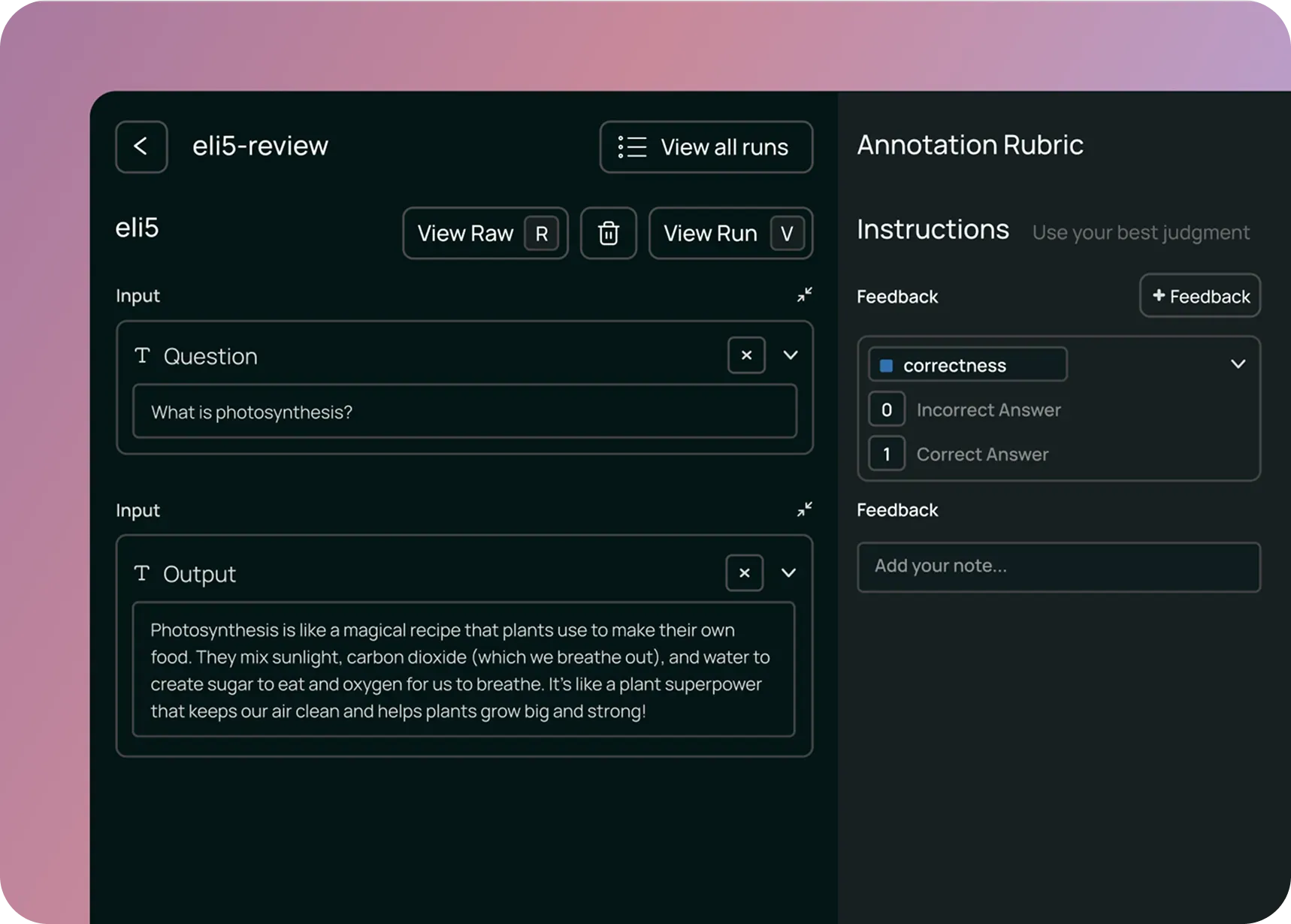 Annotation queues help make human review as efficient as possible. Rather than asking reviewers to hunt through production logs, an annotation queue presents specific runs in a structured format with a predefined rubric.