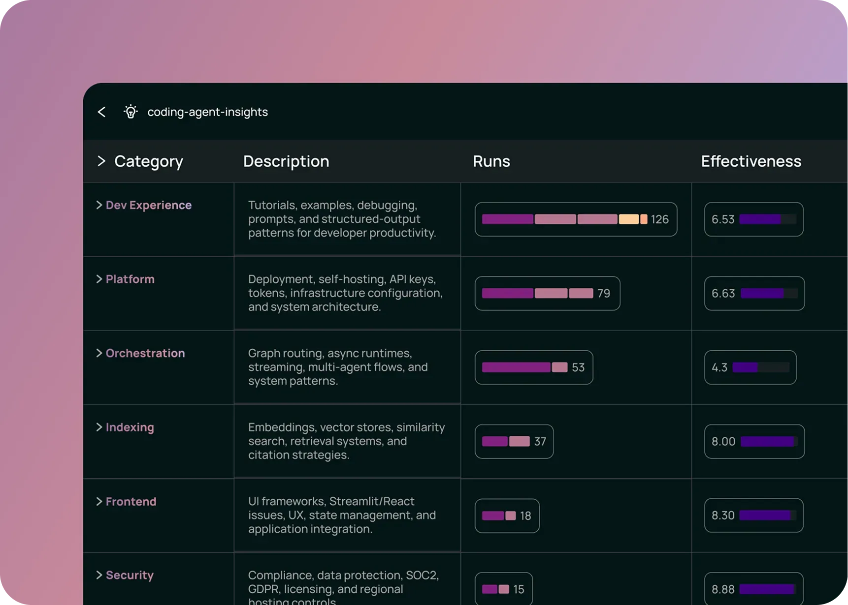 For example, a product manager at a company with an embedded copilot might ask: "What parts of our product are users trying to use the copilot for most often?" Insights Agent can analyze thousands of traces, group them by intent, and surface the top usage categories.