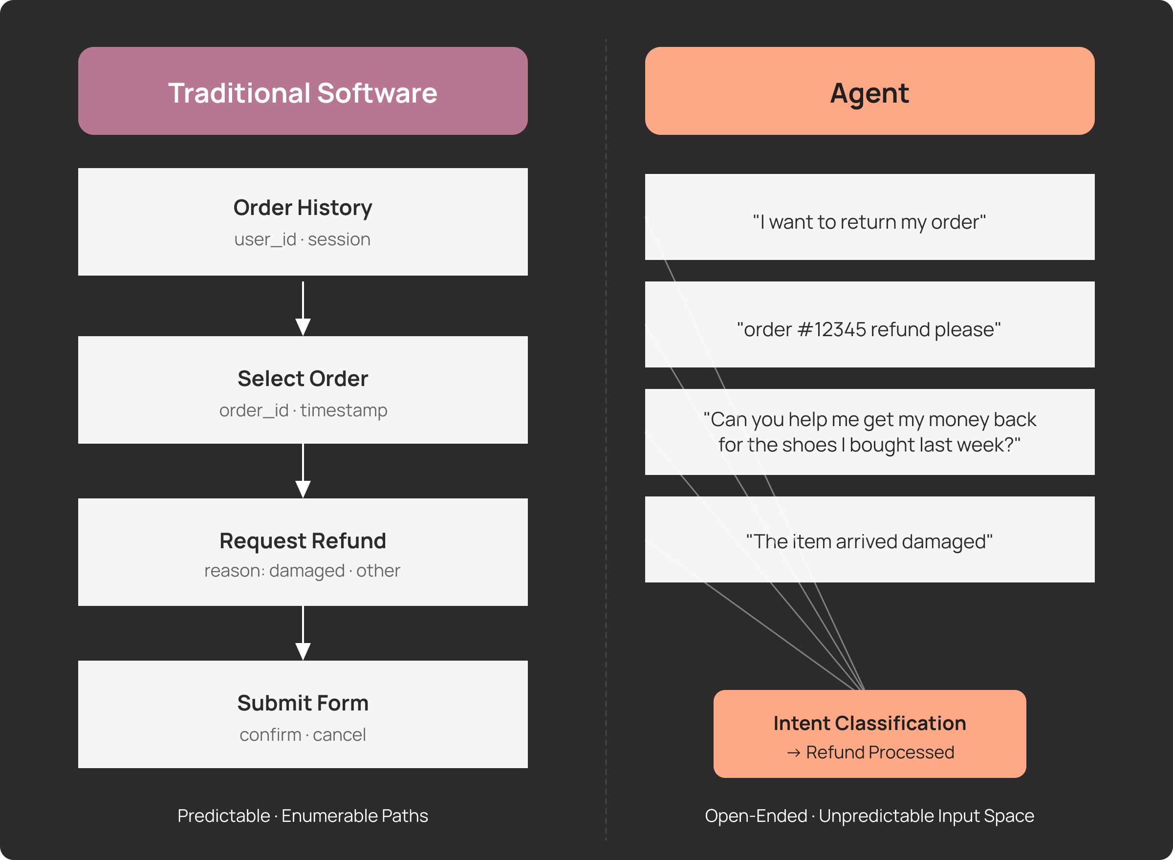 Consider a customer support agent. In traditional software, users would navigate to "Order History," click on an order, click "Request Refund," and finally fill out a form with predefined options. The path is fixed and testable.