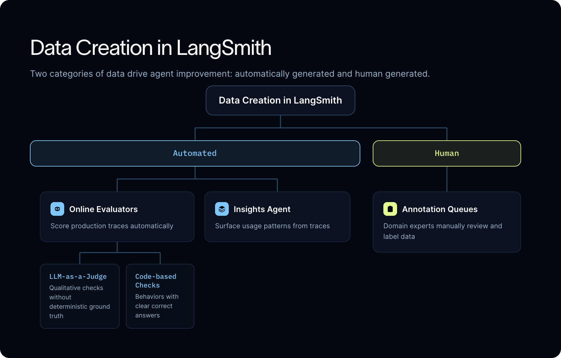 There are two categories of data that drive agent improvement: automatically generated and human generated. LangSmith helps you create both. To generate data automatically, you can use online evaluators and Insights Agent.